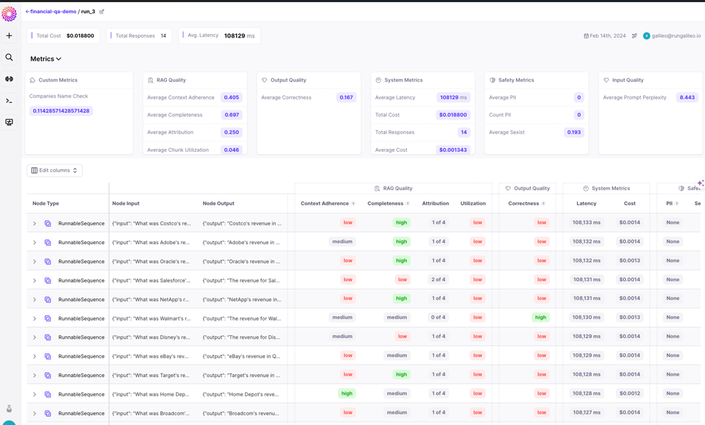 Galileo automates evaluation at scale using Luna, a suite of fine-tuned small language models trained for specific evaluation tasks like hallucination detection, prompt injection identification, and PII detection.